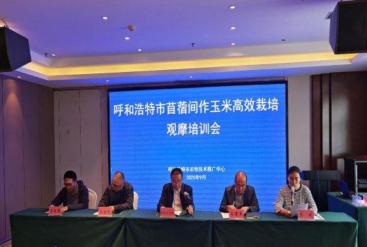根据《农业农村部关于实施养殖业节粮行动的意见》、《关于推动饲草产业高质量发展的意见》文件要求和“生态友好型饲草高效生产与综合利用”重大技术协同推广项目总体安排,为充分挖掘我市土地资源种草潜力,加强粮食和饲草生产目标任务统筹,提高土地产出效率。9月5日,呼和浩特市农牧技术推广中心召开全市苜蓿间作玉米高效栽培技术培训会。内蒙古自治区农牧业技术推广中心副主任特木尔巴根、内蒙古自治区农牧业技术推广中心饲料饲草技术处处长王永杰、呼和浩特市农牧技术推广中心主任王建华出席会议,市县两级饲草工作人员及饲草种植户共计40余人参加培训。