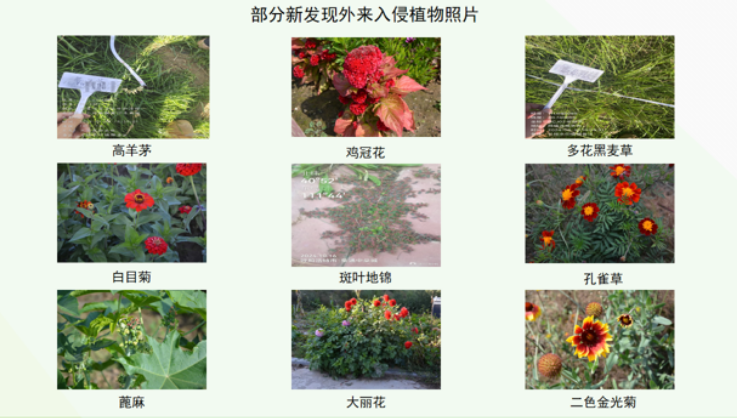 有效调查更新数据达到1324个,共计发现外来入侵物种65个,根据调查未发现豚草、屋根草和北美苍耳;新发现多花黑麦草、白三叶、高羊茅、多年生黑麦草、聚合草、蓖麻、鼠尾草、草地雀麦、大丽花、百日菊、紫茉莉、聚合草、黄金菊、金鱼草、金盏菊、鸡冠花、金光菊、孔雀草、蓝目菊、剑叶金鸡菊、二色金光菊、秋葵、苏丹草、田青等24种,其中19种作为园林绿化景观植物引入应用,对所发现的外来入侵物种制作植物标本40张。