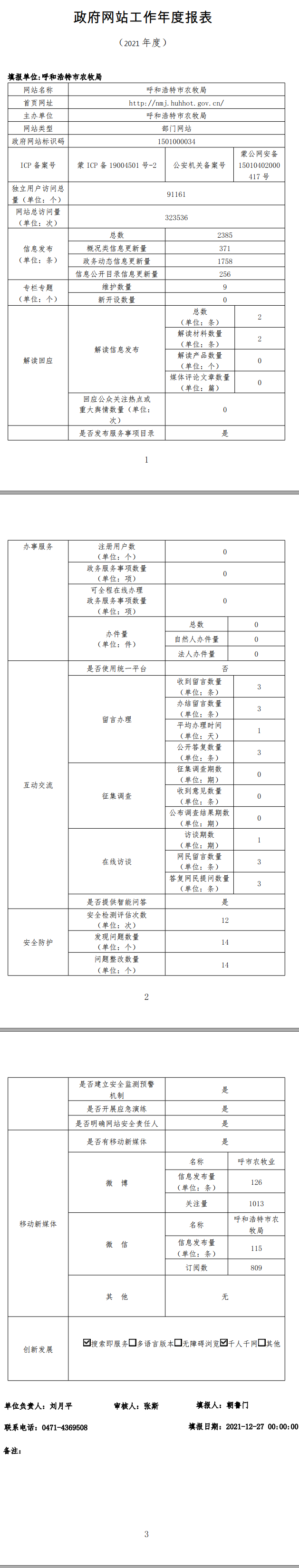 2021年呼和浩特市农牧局政府网站工作年度报表