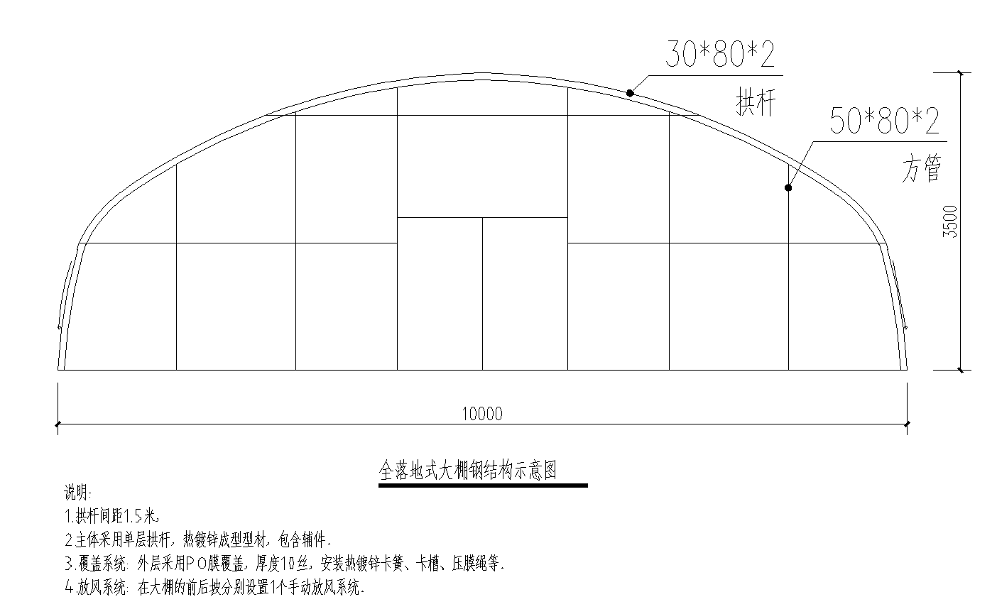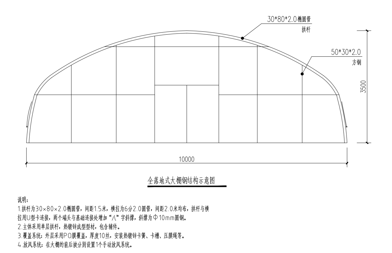钢结构骨架塑料大棚。建设质量符合国家标准《农业温室结构荷载规范》(GB/T51183-2016)的规定,基本配置和参数符合方案要求。 |