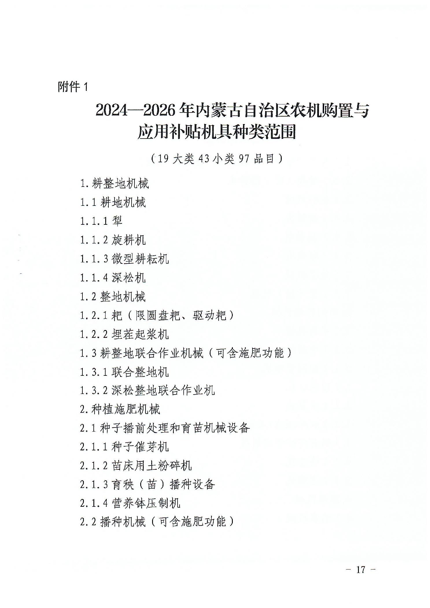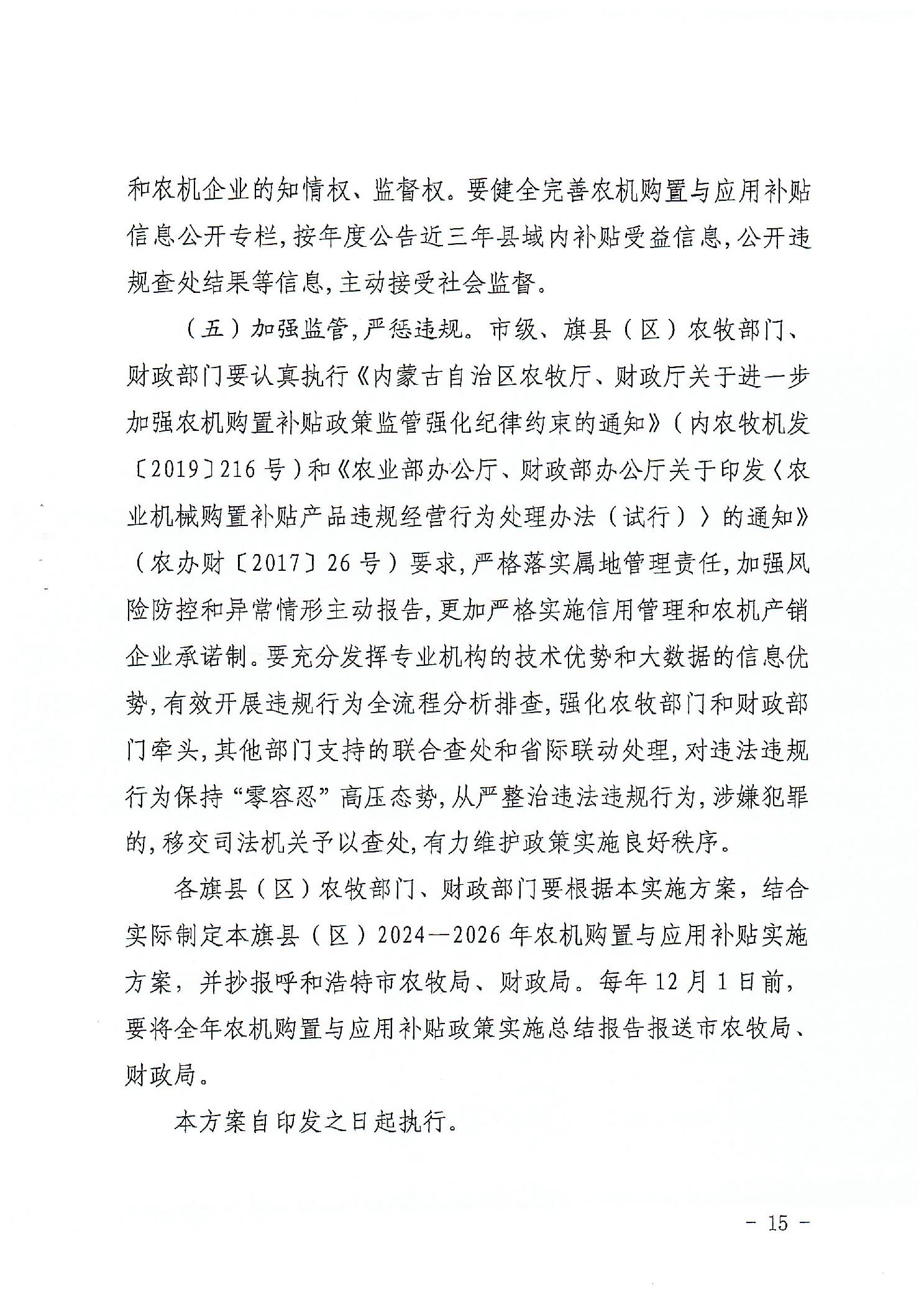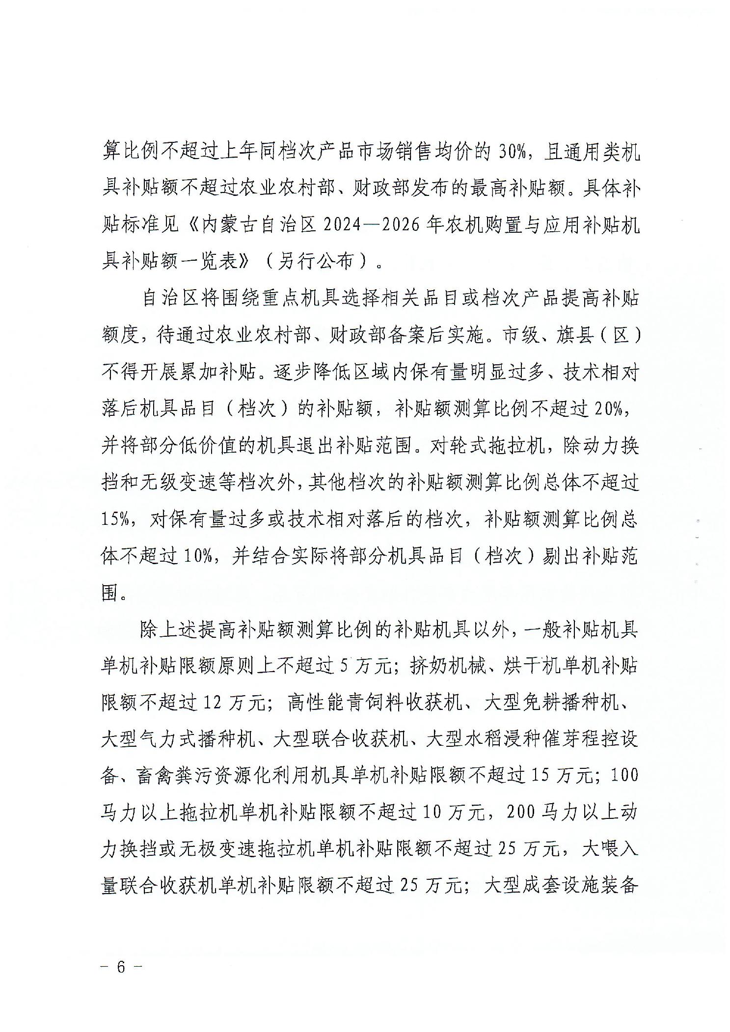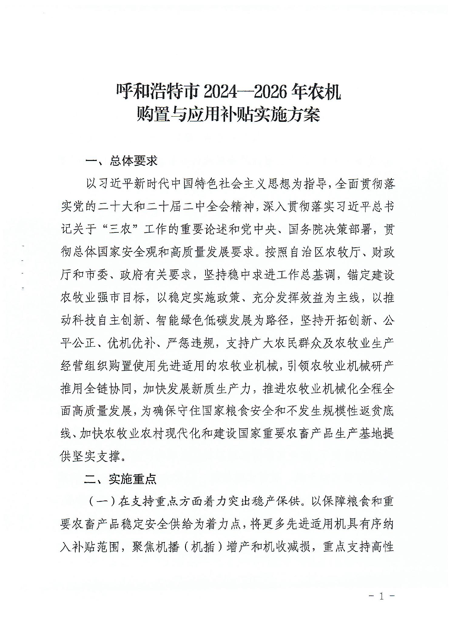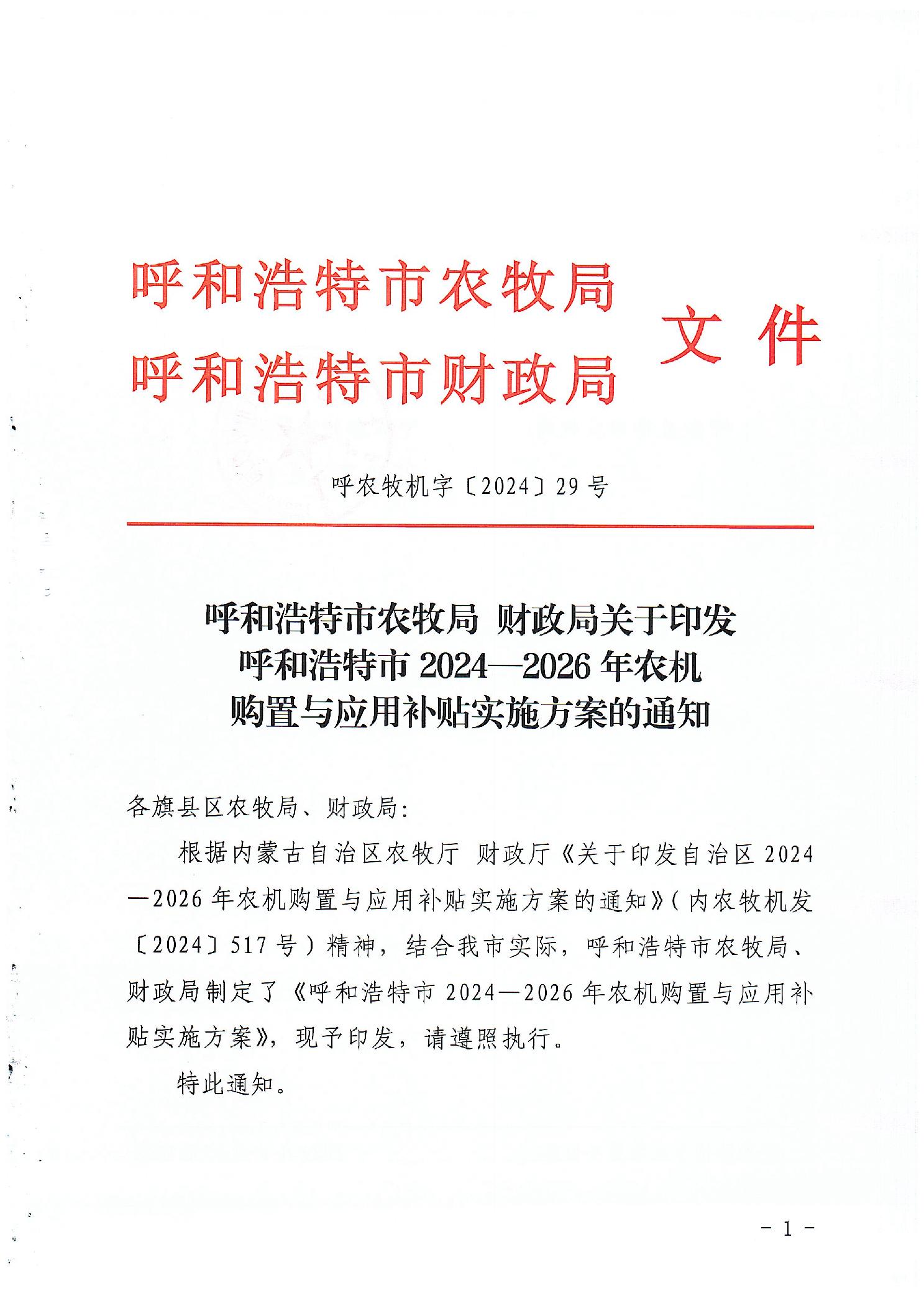 呼和浩特市农牧局 财政局关于印发呼和浩特市2024—2026年农机购置与应用补贴实施方案的通知