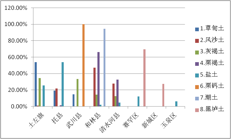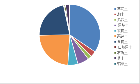 2021年4-5月,呼和浩特市农牧技术推广中心土壤肥料与节水农业技术科对我市9个旗县区分布的不同类型土壤进行统计分析。结果为:呼和浩特全市共有11大类、33亚类土壤,草甸土所占比例最大,占全市耕地面积比例为34.44%,其次栗钙土,最少土壤类型为沼泽土。具体所占比例如下图所示。